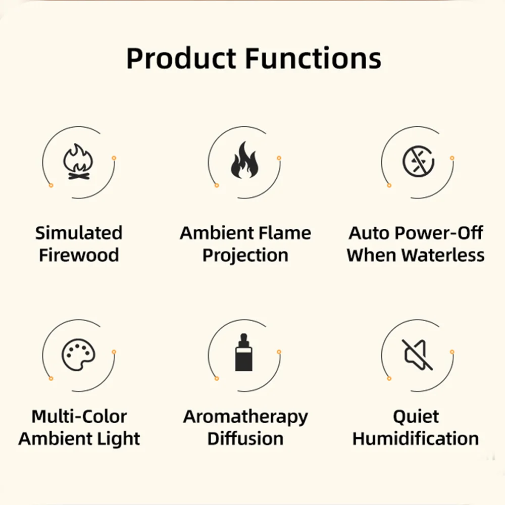 1. FLAME HUMIDIFIER:The flame aroma diffuser integrate with a built-in smart LED light that collects light and mist to create a realistic flame effect, adding a relax,soothe,calm atmosphere to your home,office,shop or more.